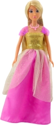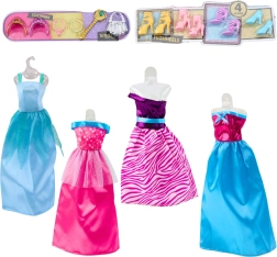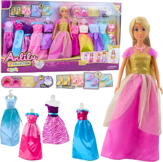 Sættet indeholder også et bredt udvalg af tilbehør: 4 par sko, 2 kroner, 2 halskæder, en tryllestav og en håndtaske, som gør det muligt for dukken at forvandle sig til en prinsesse, model eller heltinde i sine egne eventyr. Dette komplette legesæt er en perfekt måde for små piger at udforske deres fantasi og opleve sjov rolleleg.