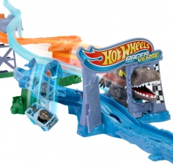 Dyk ned i Jurassic World med Hot Wheels RacerVerse Havjagten på dinosaurer, hvor Velociraptor måler kræfter med Spinosaurus på racerbanen. Det medfølgende racersæt indeholder et unikt RacerVerse Velociraptor-køretøj. Begiv dig ud i spændende løb og find ud af, hvilket af de mange mulige udfald der venter dig denne gang!