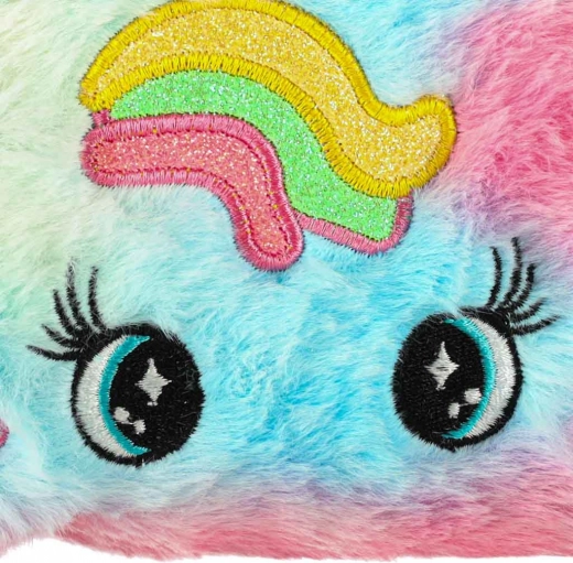 Design inspireret af en enhjørning med regnbuemønster og små ører, ideel til opbevaring af kosmetik.