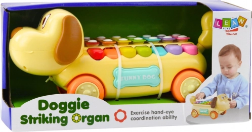 Den kørende hund er udstyret med et komplet sæt farvede bækkener, som kan fås til at klinge med den medfølgende trommestik. Takket være fastgørelsen af trommestikken til legetøjet med en snor undgås bortkomst selv under intensiv leg. Hunden er fremstillet af holdbare og sikre materialer, og dens konstruktion støtter udviklingen af hånd-øje-koordination, finmotorik og musikalsk sensibilitet. Ideel som læringslegetøj til børn fra 18 måneder.