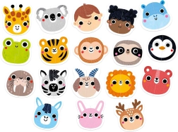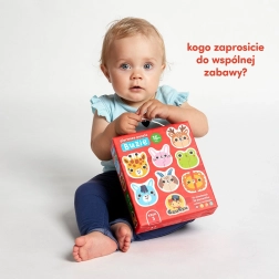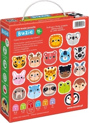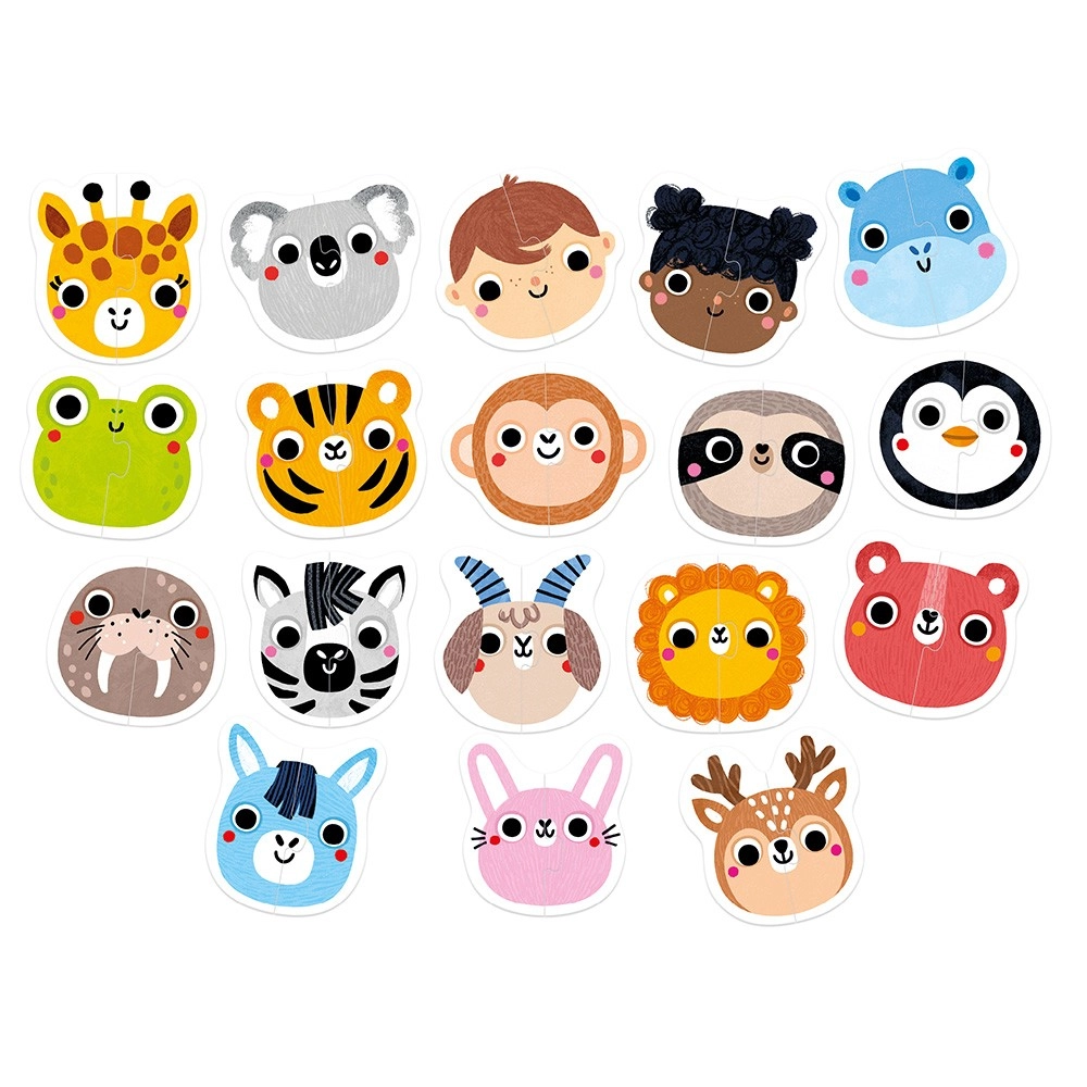 Hvad finder du i æsken? Hele 18 todelte puslespil med dyreansigter og 2 børneansigter, hvilket giver de mindste masser af muligheder for sjov leg!
