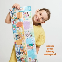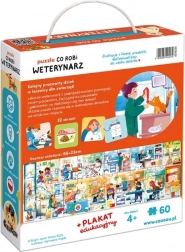 Puslespil Hvad laver en Dyrlæge er et læringssæt til nysgerrige førskolebørn og dyreelskere. Det indeholder et puslespil med 60 brikker, 32 supplerende billeder og en læringsplakat udarbejdet i samarbejde med en dyrlæge.
