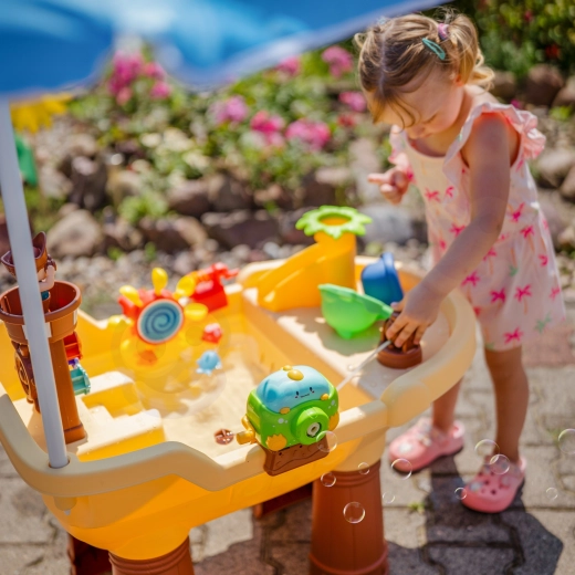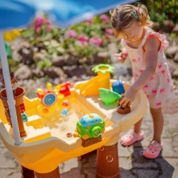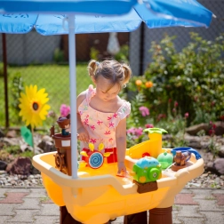 Det store Woopie vandbord i piratskibsdesign forvandler haven til en bugt fuld af opdagelser. Børn kan hælde vand, sætte vandhjul i gang, sprøjte med kanonen, lave bobler og styre skibet ved hjælp af pirattårnet og rattet. Den integrerede solparasol giver skygge selv på varme dage, så legen er komfortabel og sikker.