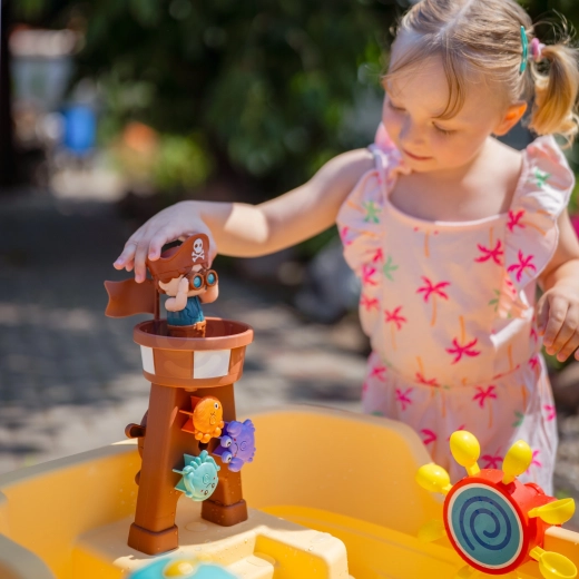 Tårn med pirat, rat, anker og vandrutsjebane skaber en autentisk piratverden. Børn hælder vand i tragtene, sætter hjulene i gang og sender vandet af sted ad banerne.