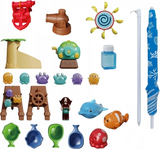- Rigt udstyr: pirattårn med figur, vandrutsjebane, vandkanon, boblemaskine, anker, rat, kopper, flydende dyr og flere hjul med vandeffekter.
