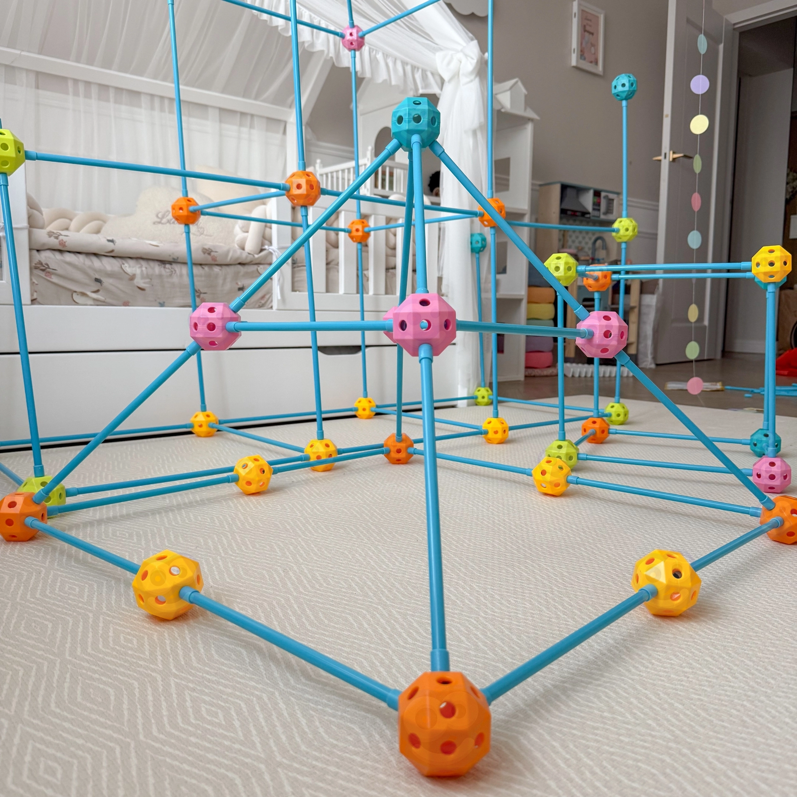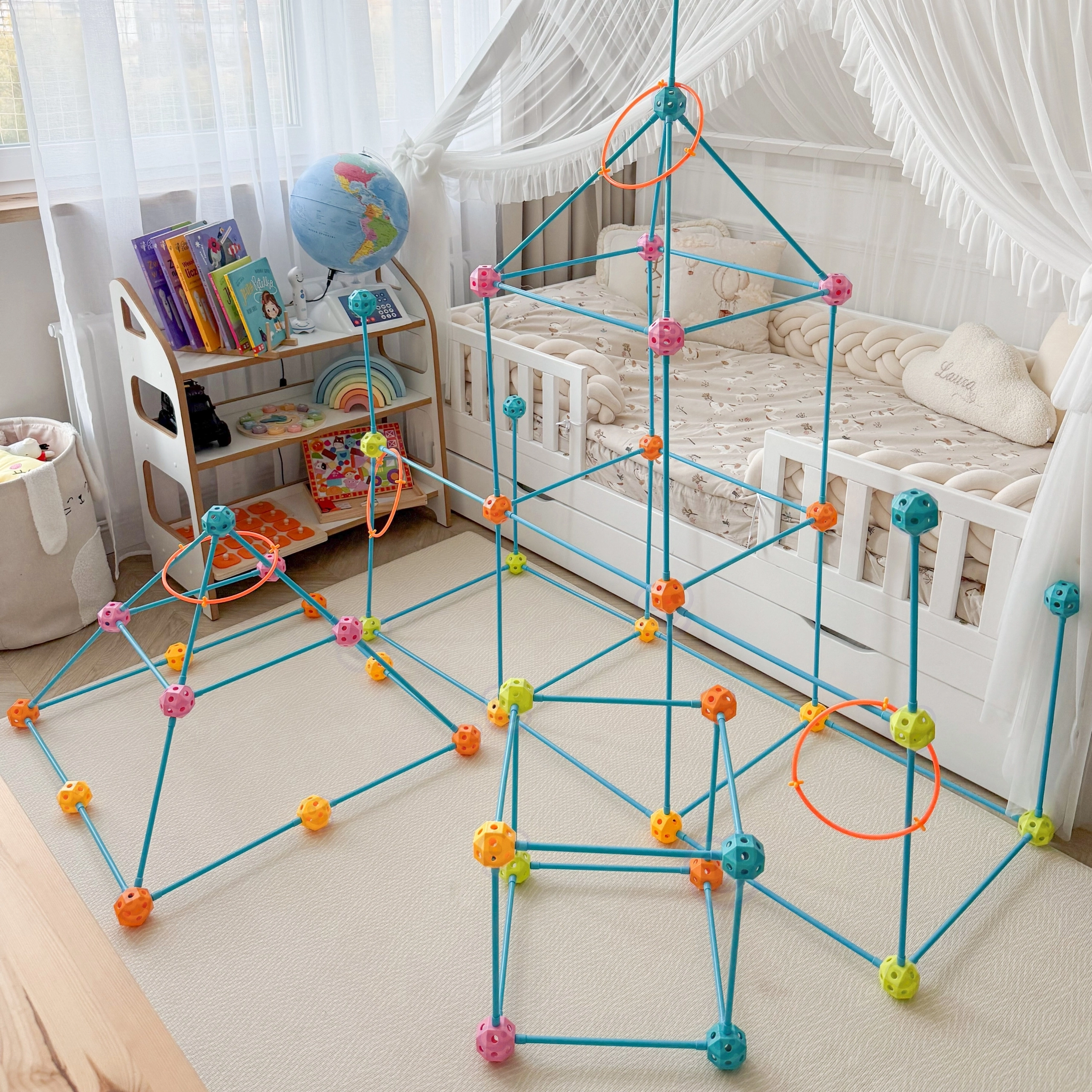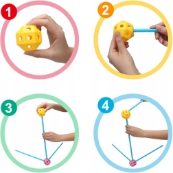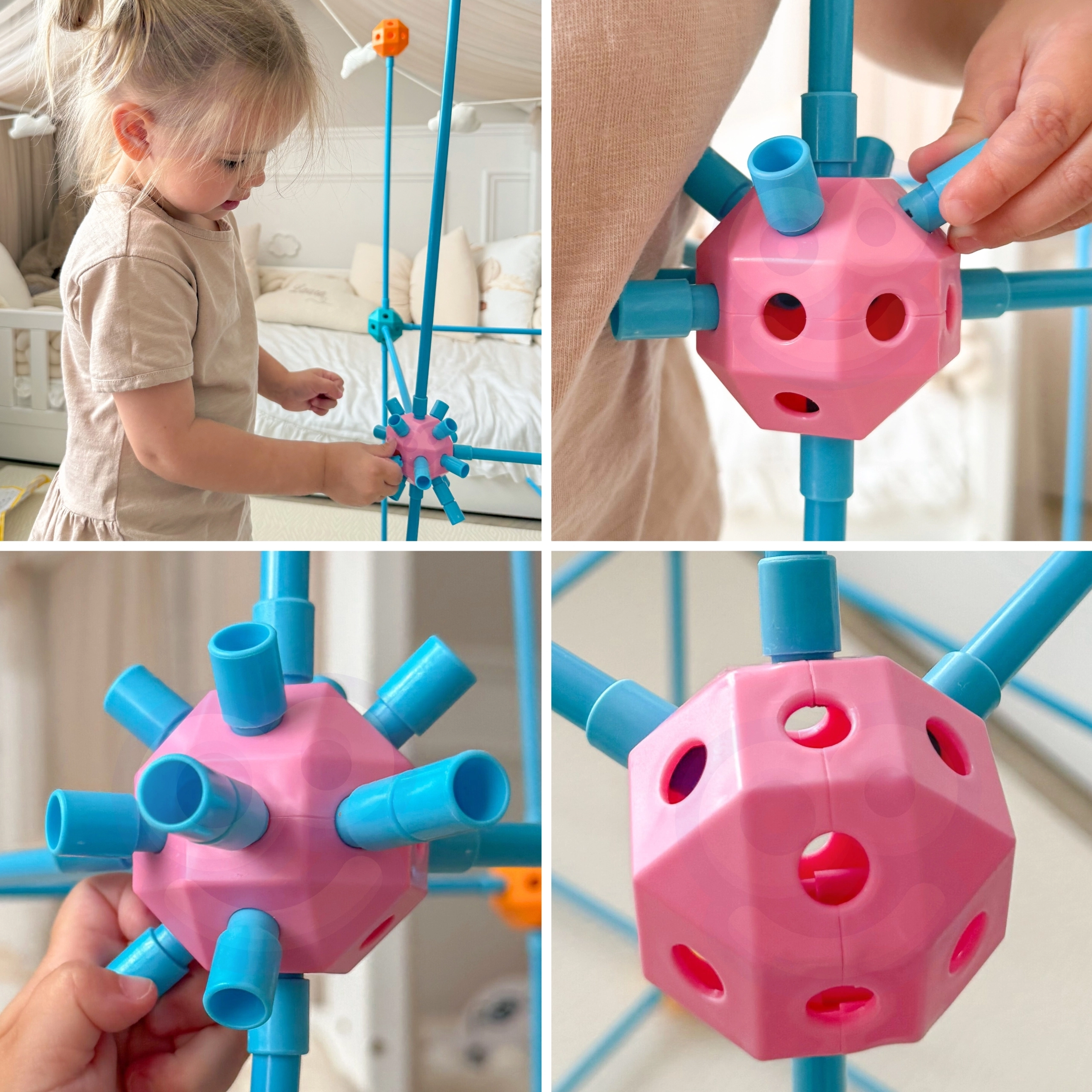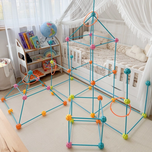 Lange stave og kugler med flere huller muliggør solide forbindelser i forskellige vinkler. Børn kan nemt skabe tårne, kupler, huse og labyrinter.
