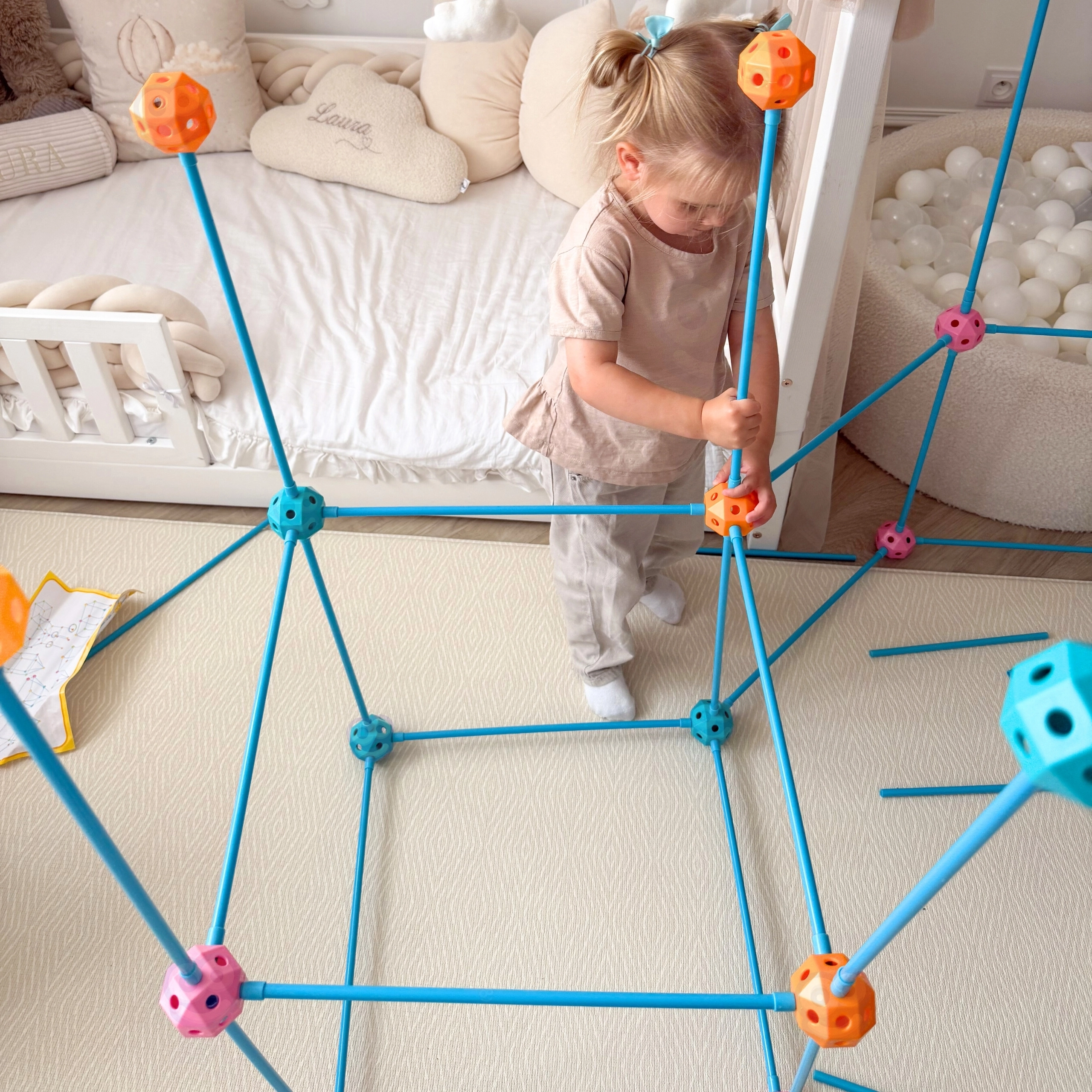 Let, glat og robust design er skabt til små hænder, uden skarpe kanter og med hurtig, intuitiv samling. Fælles byggeri udvikler teamsamarbejde, tålmodighed og rumlig forståelse og lærer samtidig grundlæggende geometri og ingeniørkunst.
