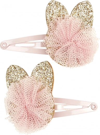 Disse smukke hårspænder er beregnet til små pyntedukker fra 3 år. Sættet indeholder to metalspænder med pink metallisk glans, som er pyntet med en gylden katteapplikation og fuldendt med en pink tyl-pompom. Denne fine detalje vil helt sikkert fortrylle enhver lille romantiker. Takket være klikmekanismen sidder spænderne sikkert i håret hele dagen. Ideelle til hverdagsbrug og særlige lejligheder.