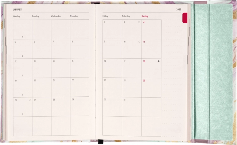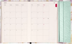 Dagbogen inkluderer også månedlige oversigter, der er velegnede til ferier eller længere ferier. Dens magnetiske lukning sikrer en sikker lukning og beskyttelse af dine planer.