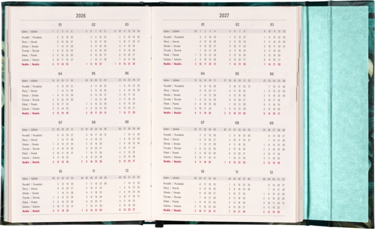 Hvis du leder efter en effektiv måde at holde styr på dine planer, er den ugentlige dagbog Monstera 2026 det ideelle valg. Takket være det horisontale layout og integrationen af den tjekkiske og slovakiske kalender tilbyder dagbogen plads til både dine personlige og arbejdsrelaterede opgaver. Nyd praktiske månedlige oversigter, som er ideelle til planlægning af længere ferier eller rejser. Dagbøgerne indeholder også en liste over tjekkiske og slovakiske helligdage og navnedage.