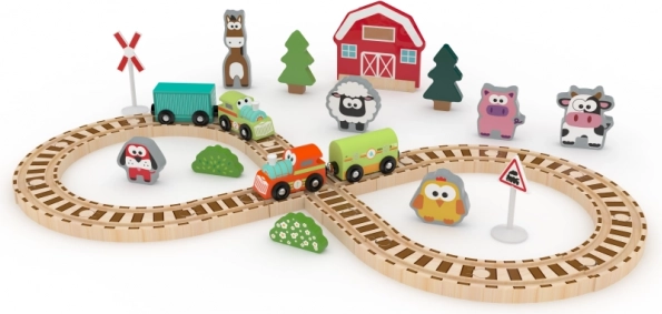 Oplev magien i en træverden med et bondegårdssæt på 35 dele, der udvikler børns fantasi og motorik. Indeholder skinner, tog, dyr, hus og træer af bæredygtigt træ, velegnet til børn fra 3 år.