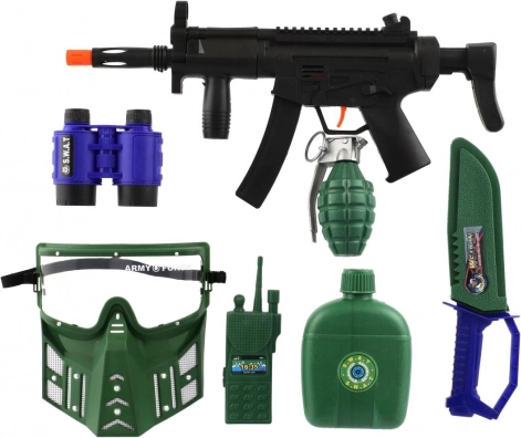 Gør dig klar til eventyr med dette militærsæt, der indeholder en plastklaprende maskinpistol og tematisk tilbehør, ideelt til at udvikle fantasi og aktiv leg.