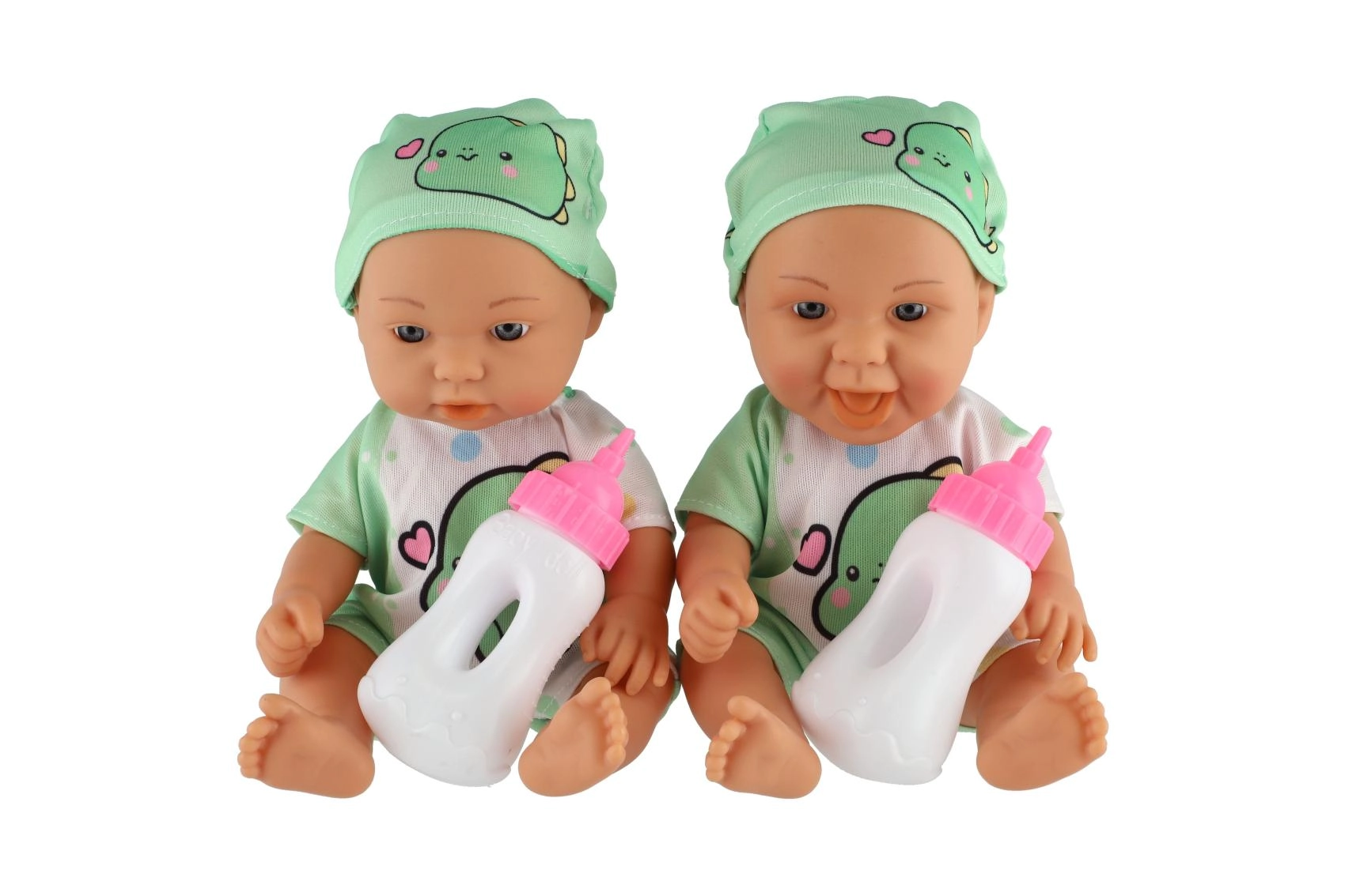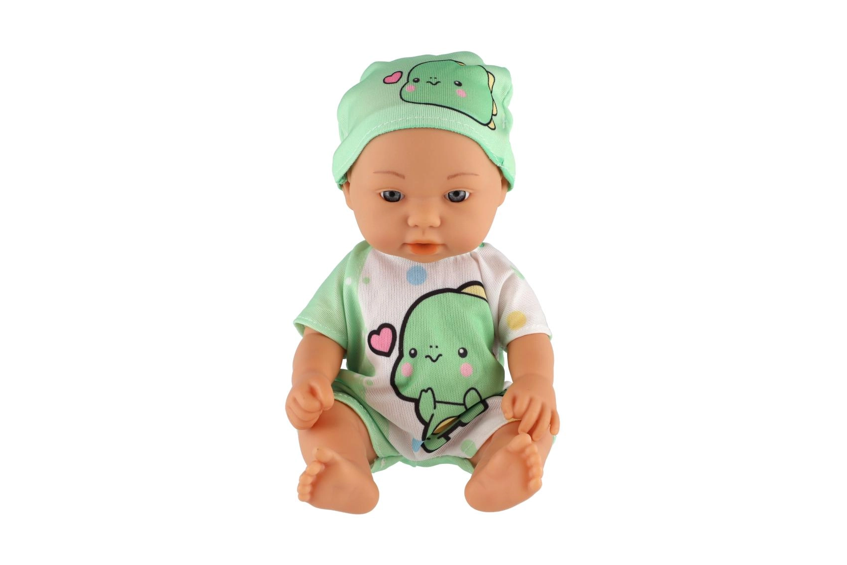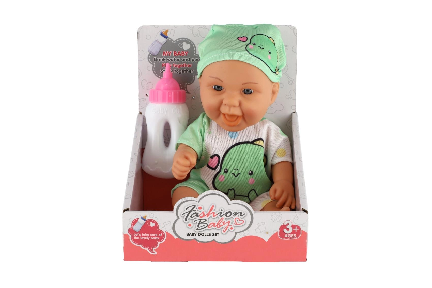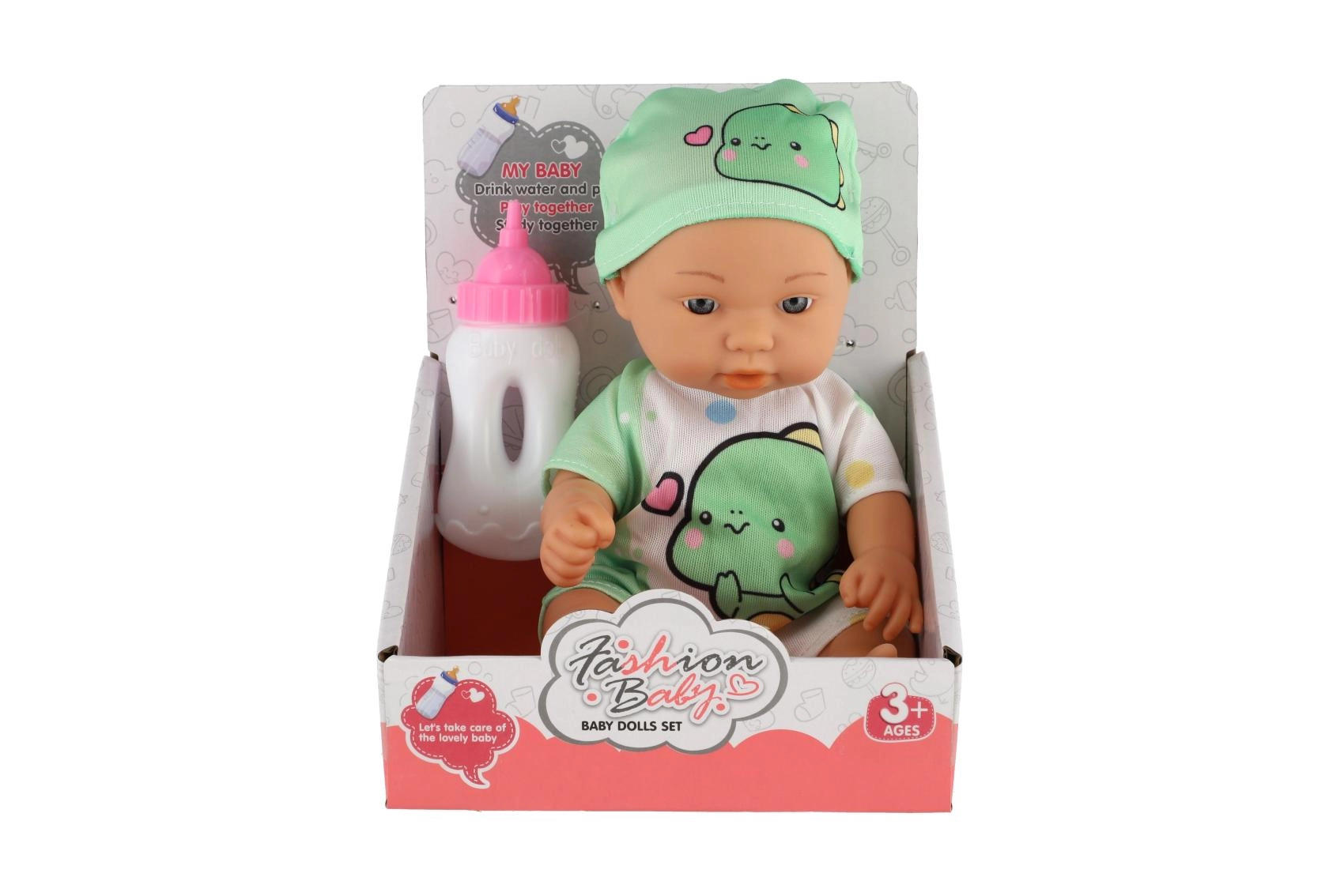 Sød lille babydukke med realistiske detaljer, ideel til små mødre. Indeholder en fast krop og en flaske til fodring.