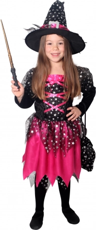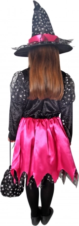 Magisk kostume til små hekse! Dette sort‑pink kostume er ideelt til piger fra 4 til 6 år, pyntet med pink bånd og sølvstjerner.