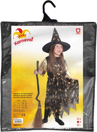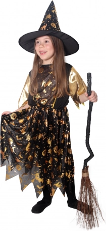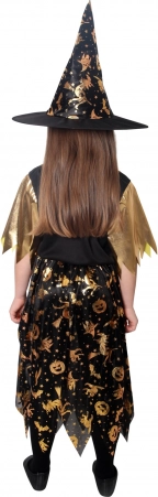 Halloweenkostume til små hekse! Kostumet i sort-guld er ideelt til piger i alderen 6-8 år. Gyldne halloweenmotiver gør denne kjole uimodståelig. Et perfekt matchende heksehat er inkluderet.