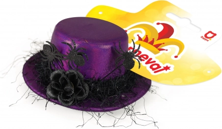Elegant minihat i en iøjnefaldende lilla farve med sort blomst og edderkopper giver et unikt tilbehør til ethvert outfit.