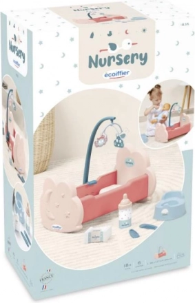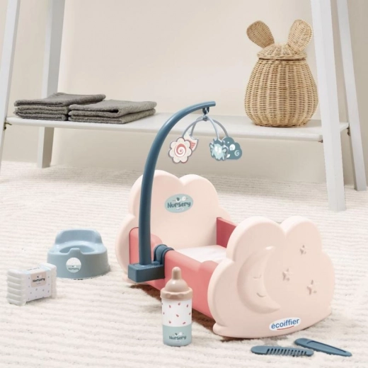 Fantastisk børneseng til dukker med komplet tilbehør til den perfekte leg. Inkluderer en karrusel over sengen, en flaske, en potte og en kam for den bedste dukkepasningsoplevelse.