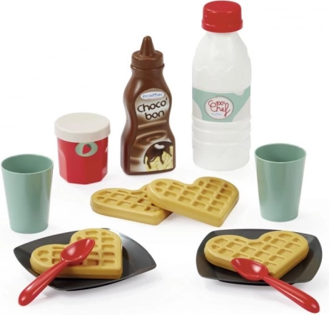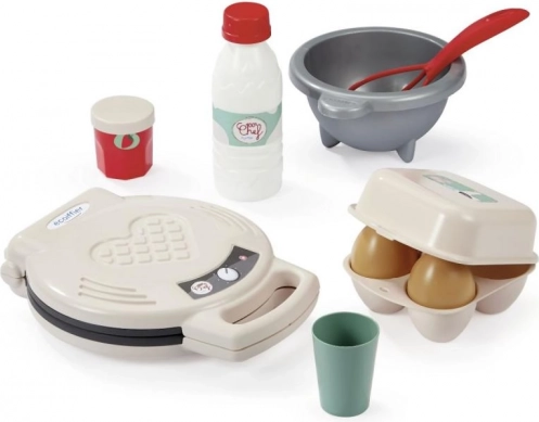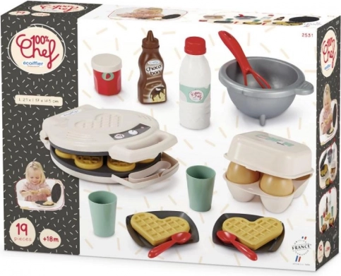 Dette vaffeljern er ideelt til børn, der ønsker at eksperimentere med bagning. Sættet indeholder alt, hvad der er nødvendigt for at forberede lækre vafler. Vaffeljernet, hvis dimensioner er 21 x 17 x 5 cm, leveres med forskellige tilbehør. Du kan vælge mellem at forberede vafler med marmelade eller chokoladeovertræk. Pakken indeholder også service til to, æg, mælk og skål med piskeris.