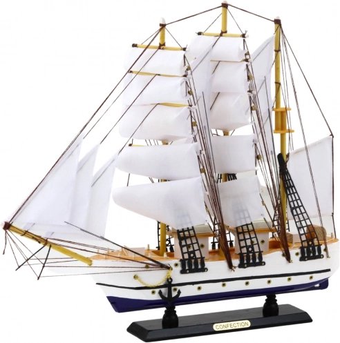 Materialeudførelse omfatter et dæk i træ, malede sider og håndspændte liner og sejl. Skibet er placeret på en sort sokkel med inskriptionen “Confection”, som understreger dets udstillingspræg.