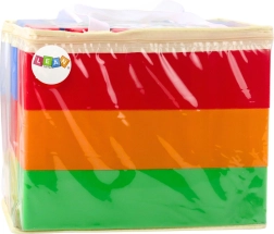 Alt er pakket i en farverig taske med hank, som gør det nemt at opbevare og transportere klodserne, både hjemme og på farten.