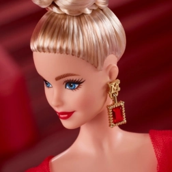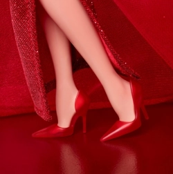 Rød rubin høje hæle komplementerer hendes betagende look og gyldne øreringe med motivet 'M' henviser til Mattels traditionelle logo.