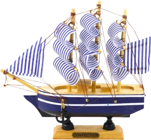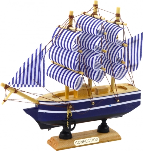 Fremstillet af træ og hånddekoreret, modellen er placeret på en stabil holder med skilt, hvilket gør det let at placere den på bord, hylde eller i vitrineskab. Den kompakte størrelse passer godt i mindre rum og bringer maritim stil og en følelse af rejse ind i interiøret. Et glimrende valg til både moderne og klassiske indretninger, den liver op i arrangementet og fanger blikket. Ideel som gave til elskere af sejlbåde, rejser og maritime dekorationer.