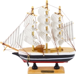 Denne kompakte model af et tremastet skib er en elegant kopi af et klassisk fartøj med kontrastfyldt design i sort, hvid og rød. De karakteristiske sejl med tynde striber og realistisk rig, sammen med den tremastede konstruktion, gør den ideel til udstilling.