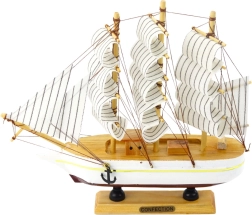 Denne replika er lavet af træ og håndafsluttet, hvilket sikrer autenticitet og kvalitet. Kombinationen af den lyse skrogfarve og sorte striber på de hvide sejl skaber en visuelt iøjnefaldende kontrast.