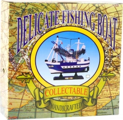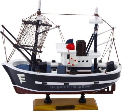 Modellen Flying Lady er en dekorativ replika af en klassisk fiskerbåd, inspireret af fartøjer brugt til kyst- og havnefiskeri. Den har en karakteristisk overbygning, et højt kaptajnstårn, én mast med rig og tekniske detaljer, der imiterer radarer og skorstene, hvilket giver den et unikt, realistisk udseende. Den er lavet af træ og håndfærdiggjort, hvilket giver den samlerværdi og en markant maritim karakter.