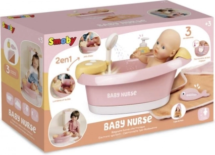 Giv dine dukker et bad i det elegante Smoby Baby Nurse-badekar. Denne legeting vil glæde enhver lille mor takket være funktionerne i den elektroniske bruser og bobleeffekten med lys.
