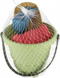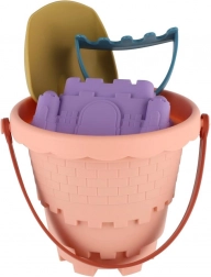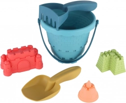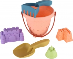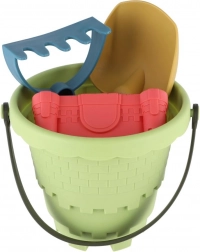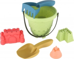 Spand, skovl, rive og tre forme til kreativ bygning og formning af sand i ét let sæt.