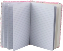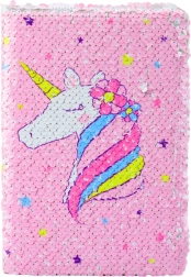 Forsiden på notesbogen er dækket af bevægelige, glitrende pailletter, der skifter farve fra lyserød til hvid blot ved en håndbevægelse. Under dette fascinerende lag finder du et magisk enhjørningemotiv med blomsterpynt, som vil begejstre enhver elsker af magiske væsner.