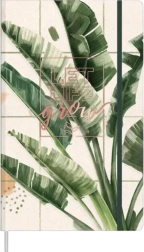 Nyd elegancen ved en notesbog med hård, mat omslag, prydet med et realistisk motiv af store grønne blade på en lys baggrund. Den centralt placerede tekst “Let life grow” tilfører en positiv stemning og blid energi.