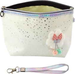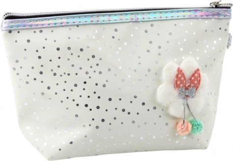 Pungen har en pålidelig lynlås og et behageligt håndgreb med karabinhage, som gør den let at fastgøre på en rygsæk eller bære om håndleddet. Pyntet med en silkesløjfe og en pompon, der giver charmerende stil. Overfladen er dekoreret med glimmer, der glimter i lyset og skaber et attraktivt, moderne udtryk.