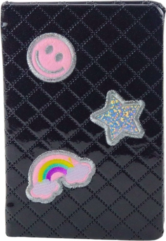 Notesbog i B6-format med sort omslag dækket af en beskyttende film, som sikrer langvarig holdbarhed og stil. Brokadefinish sammen med patches i form af en stjerne, et smil og en regnbue giver et moderne look.