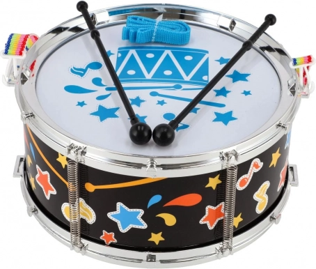 Start jeres egen musikshow! En farverig plastiktromme med praktisk rem og trommestikker er ideel til små musikentusiaster. Børn kan tromme hvor som helst og når som helst – legen udvikler naturligt rytme, finmotorik og kreativitet.