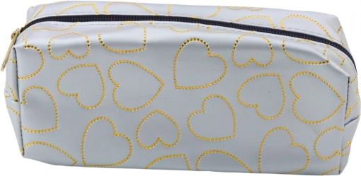 Stilfuldt og funktionelt penalhus i elegant sølvfarve med mønster af gyldne hjerter, ideelt til studerende og alle, der sætter pris på praktiske og moderigtige accessories.