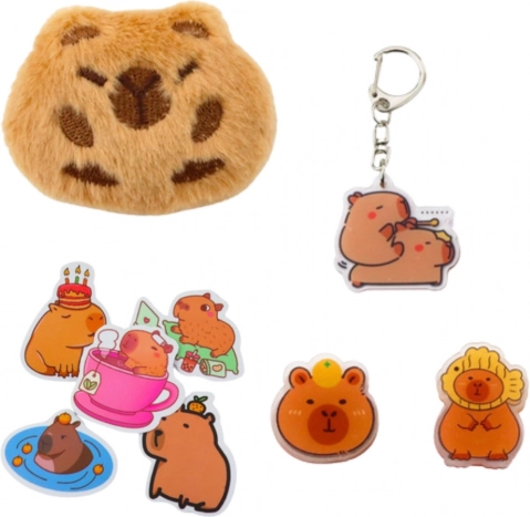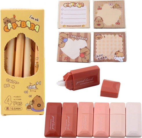Sættet indeholder et rigt udvalg af kapibara-inspireret tilbehør: 4 penne med sort blæk, 6 viskelædere til rettelser, 4 sæt dekorative selvklæbende memoer, en plyskapibara med broche, en nøglering med kapibara, 2 hårklemmer med kapibara og 5 sjove klistermærker. Dette produkt er en ideel gave til elever, dyreelskere eller enhver, der elsker unikt tilbehør til læring.