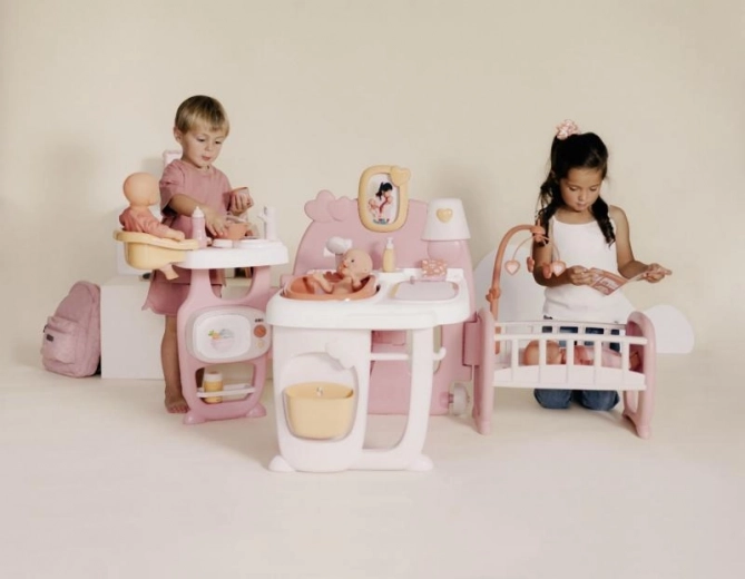 Baby Nurse dukkelegecenter med tre zoner, sammenklappeligt og let at transportere. Perfekt til dukker op til 42 cm.