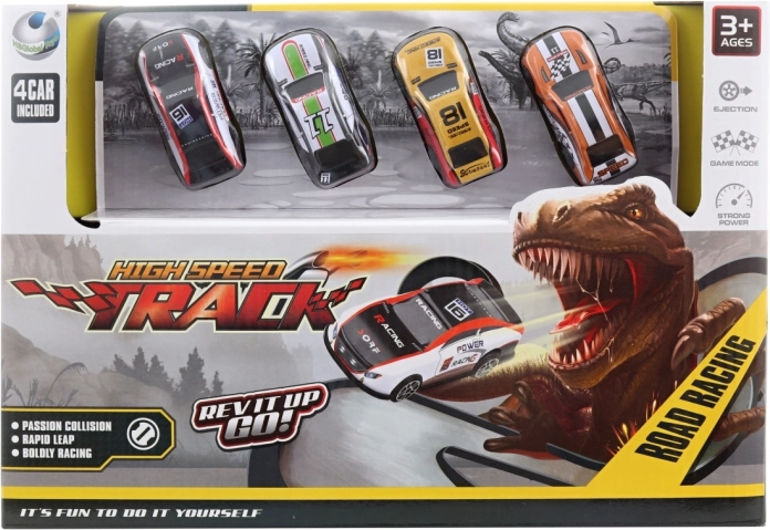 Affyringsbane med dino og 4 biler til børn fra 3 år. Holdbar plast, kompakt emballage 31x22x8 cm.
