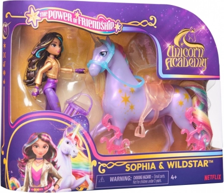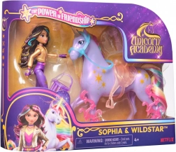Sæt med figurer fra Enhjørningeakademiet: Små dukker Sophia og Gwiazda giver en fantastisk legeoplevelse. Dukken Sophia, 11 cm høj, har realistiske og detaljerede træk, inklusive metalliske kraftsymboler og 7 bevægelsespunkter til dynamiske positurer.