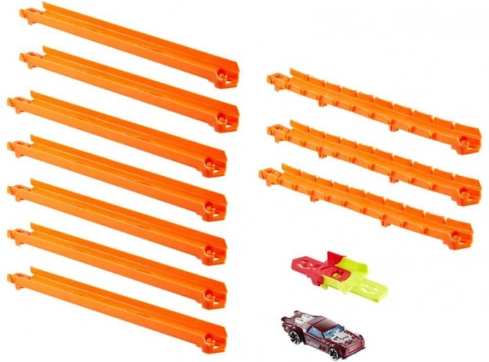 Sæt gang i kreativ racerkørsel med Hot Wheels Track Creator. Sættet bringer ca. 3 m af den ikoniske orange Speed Snap-bane, som kan kombineres frit. Tre fleksible stykker (ca. 30 cm) og syv faste lige stykker (ca. 30 cm) gør det muligt at designe enkle sprint såvel som længere baner med tilslutning til andre sæt.