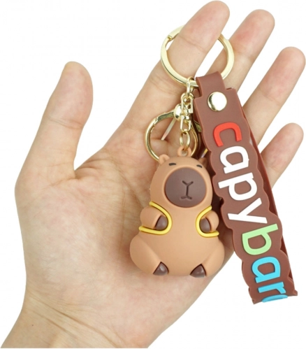 Sødt kapybara-vedhæng med gul rygsæk i blød silikone, ideelt til nøgler, rygsække og som gave.