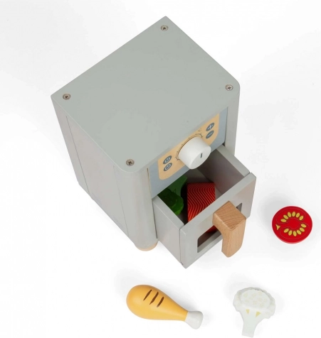 Træ-varmluftfriture fra Bigjigs Toys lader små børn opleve glæden ved at lave mad. Den er udstyret med en drejeknap til valg af temperatur, en opbevaringsskuffe og fem træmadvarer. Perfekt til at udvikle finmotorik og kreativitet.