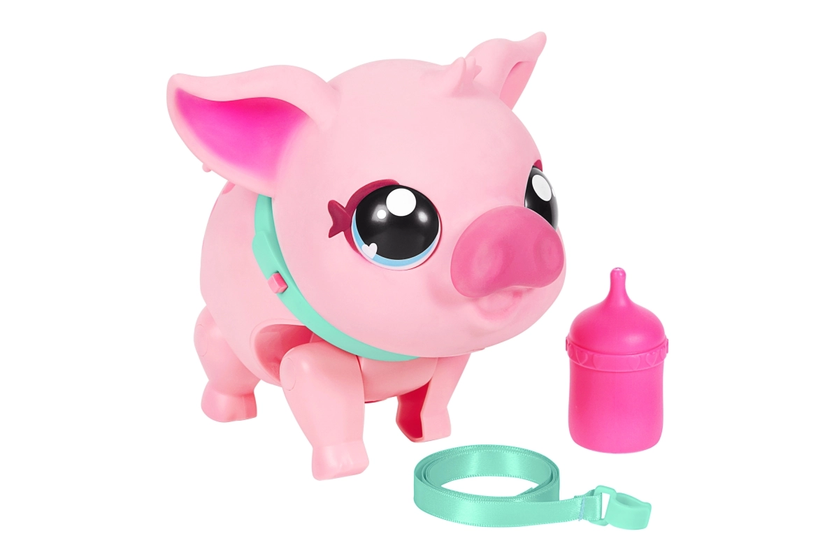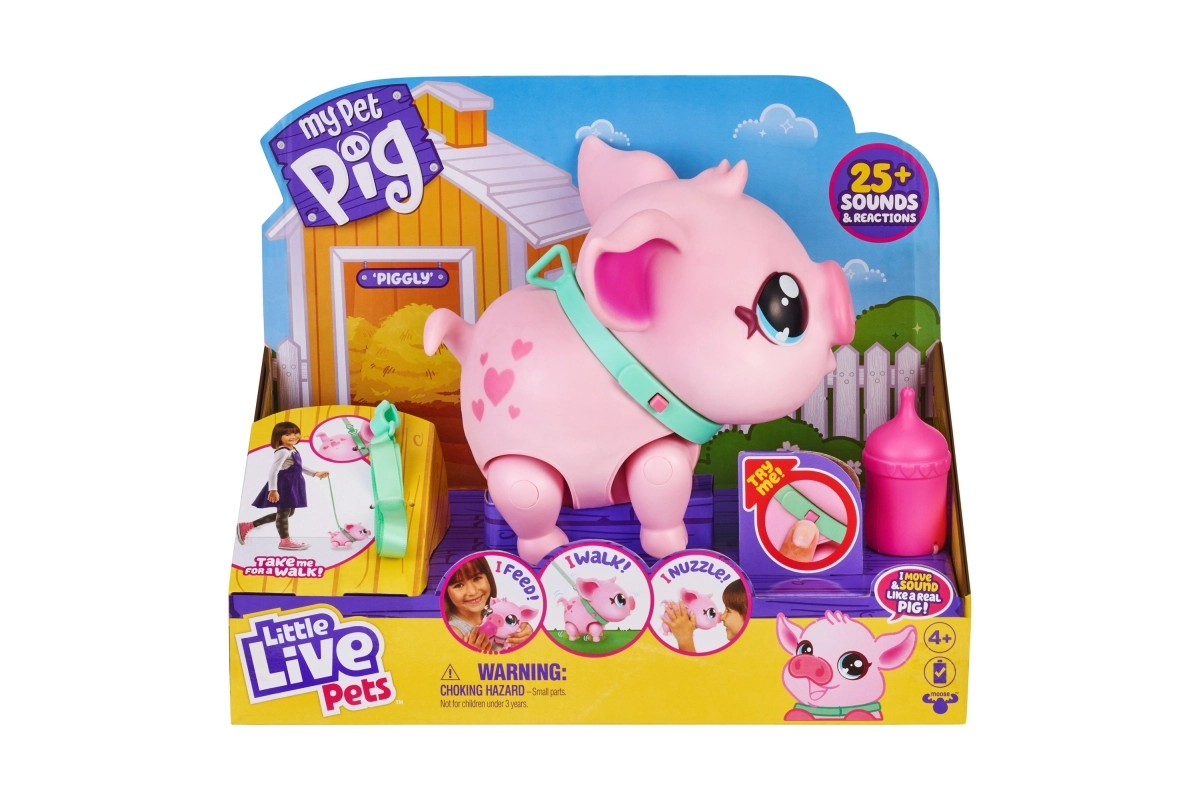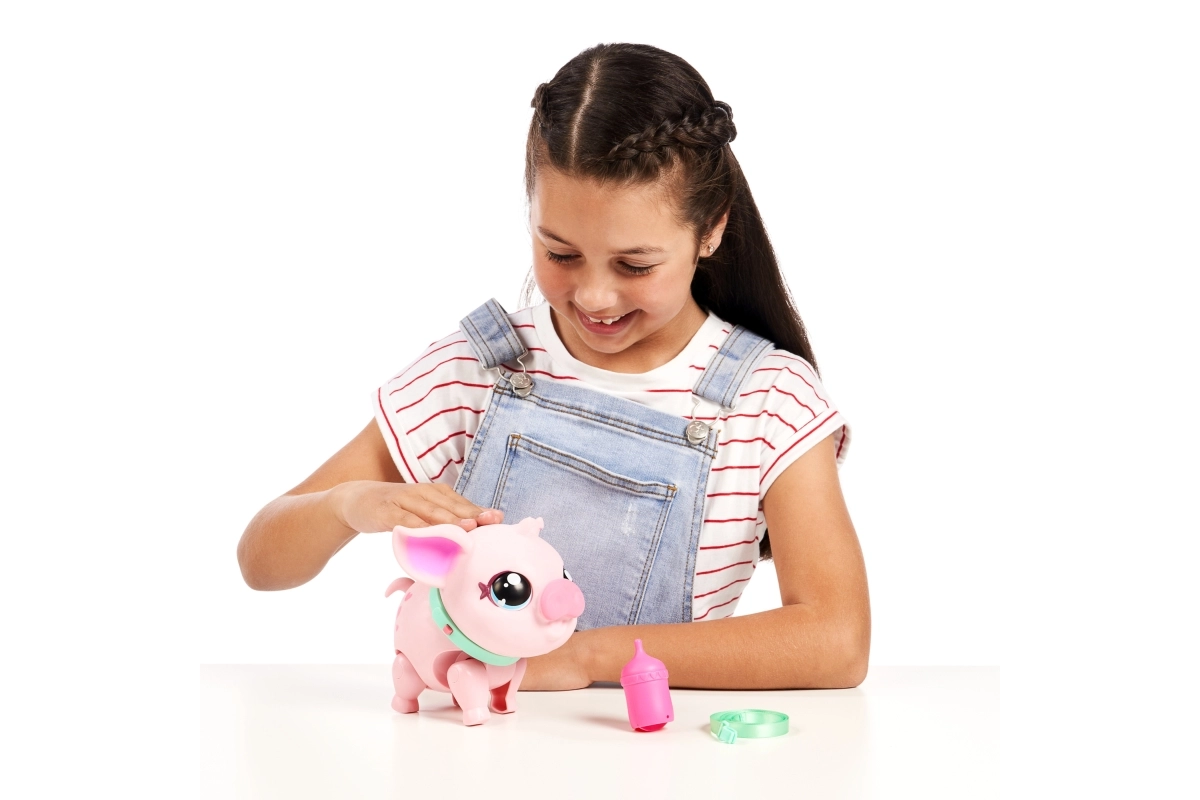 Oplev et magisk kæledyr, der vækkes til live i børns hænder. Piggly er en blød lyserød gris med søde øjne og halsbånd, som reagerer på berøring, bevægelse og omsorg. Med snoren kan du nemt tage den med på tur, og når den bliver sulten, giver du den flasken.