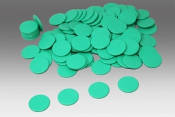 Universelle grønne jetoner ideelle som tilbehør til bræt- og læringsspil. De understøtter udviklingen af regnefærdigheder og kan bruges til pointtælling og visualisering af opgaver.