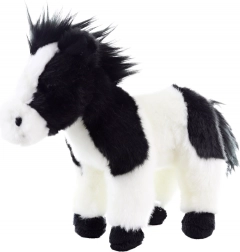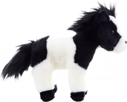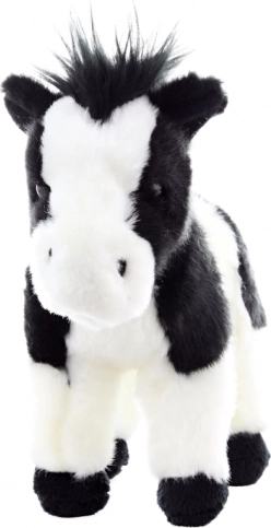 Plys hesten har et realistisk sort-hvidt mønster, som giver et autentisk udseende. Dens bløde manke og hale forstærker følelsen af virkelighed.
