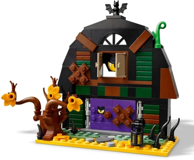 Flagermus på taget, et skævt træ, en lampe og specialelementer (øje, grøn flaske, sort glas) giver modellen et autentisk Halloween-look.