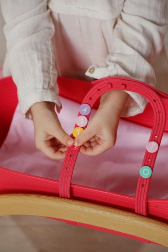 Farverige knapper kan nemt klikkes på håndtagene og langs kurvens kant. Børn kan igen og igen personliggøre sengen og udvikle fantasien.