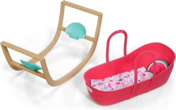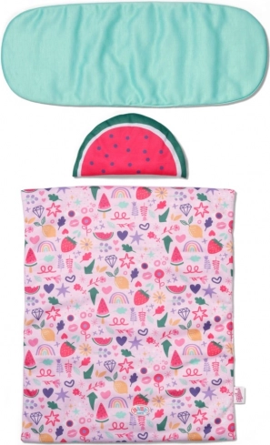Vandmelon-formet pude, blød madras/underlag og et farverigt tæppe med frugtmotiver giver dukken komfort ved hvile og sengetid.